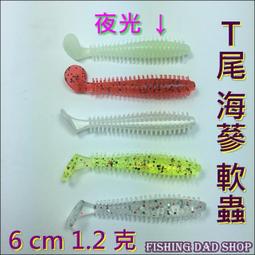 -釣魚夢想家-路亞軟餌 6cm 1.2克 T尾海蔘 有夜光 T尾 單尾軟蟲 擺尾軟蛆 擬餌 搭配曲柄鉤 鉛頭鉤 德州釣組