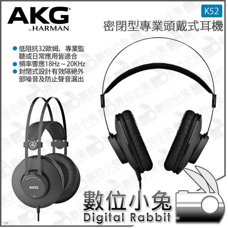 數位小兔【AKG 密閉型專業頭戴式耳機 K52 台灣公司貨】錄音室 耳罩式 監聽 密閉式 封閉式 降噪