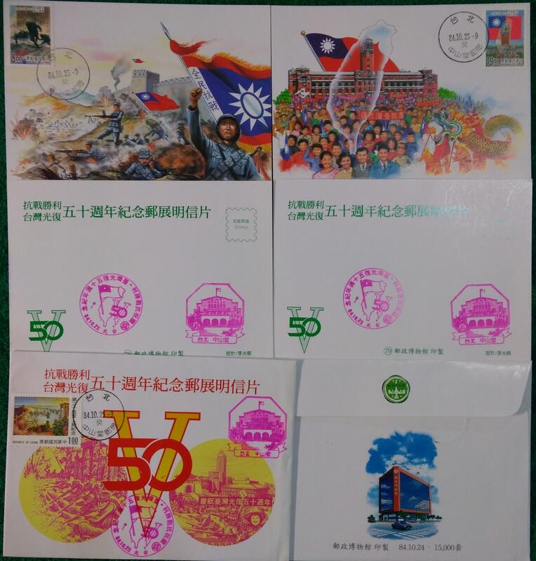 3全1組特聘郵票設計者李光棋先生設計郵博發行抗戰勝利台灣光復50週年紀念原圖明信片貼套票與軍人節票蓋中山堂郵戳滿千免運費