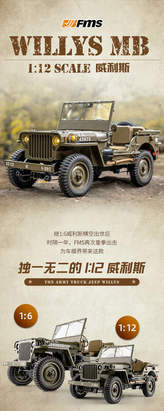 港都RC FMS 1:12 WILLYS MB 1941 SCALER 二戰 攀爬 威力吉普車 RTR版