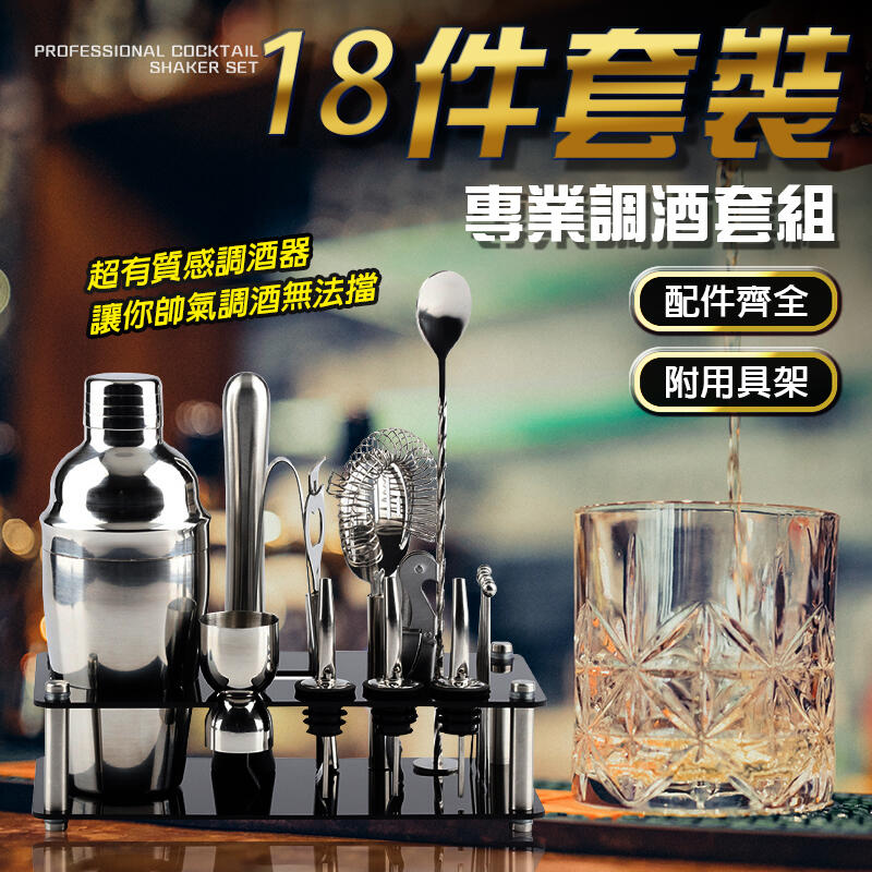 【全新現貨】 豪華18件套裝 專業調酒套組 買就送壓克力器具架 不鏽鋼調酒用具 調酒組 調酒器 調酒器具 三段式雪克杯