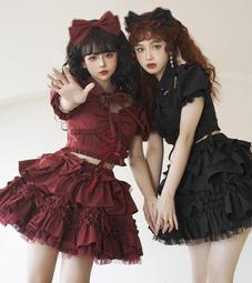 塔莉亞之歌🎀春夏日系原宿純色紅黑打歌服短袖方領紗辣妹短蛋糕裙SK綁帶蝴蝶結蕾絲荷葉邊Lolita蘿莉塔軟妹半