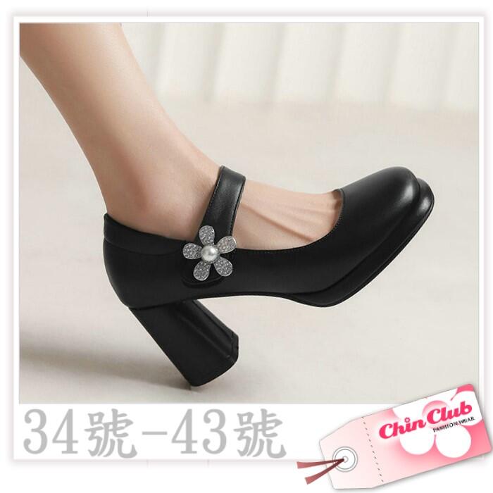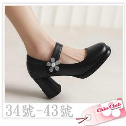 34-43大尺碼小尺碼女鞋 厚底防水台方頭高跟娃娃鞋 魔術貼素面粗跟高跟包鞋☆↖ChinClub↗☆[5423]