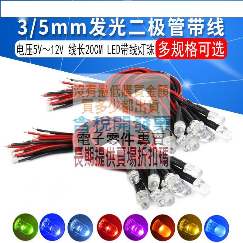3/5mm發光二極管帶線5V~12V LED燈珠車船模型電源信號指示小燈泡