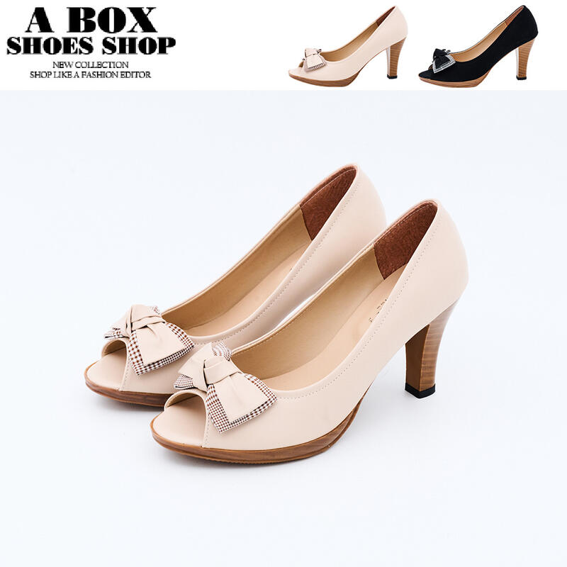 格子舖*【KM6731】MIT台灣製 跟高9cm 魚口高跟鞋 露趾蝴蝶結皮面高跟鞋復古木紋 黑 米 二色