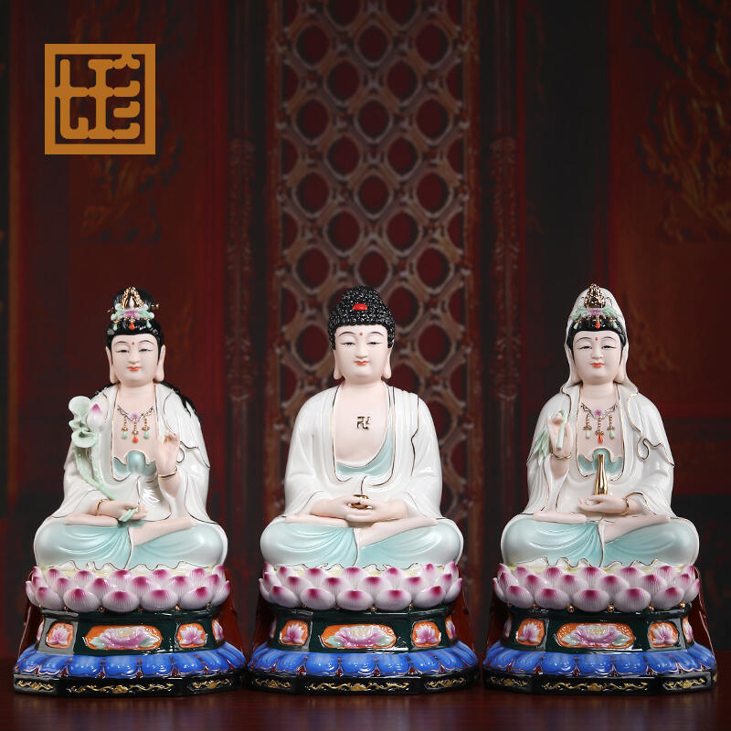 七珍 陶瓷金剛座西方三圣擺件阿彌陀佛觀音大勢至菩薩像供奉佛像