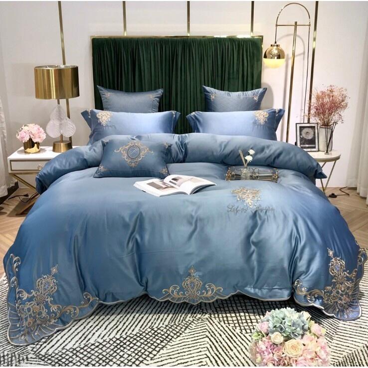 台灣現貨AB版 100%精梳棉+水洗真絲 刺繡床包四件組 床包組 床罩組 全棉純棉 素色 標準|加大雙人 不勾絲不掉色