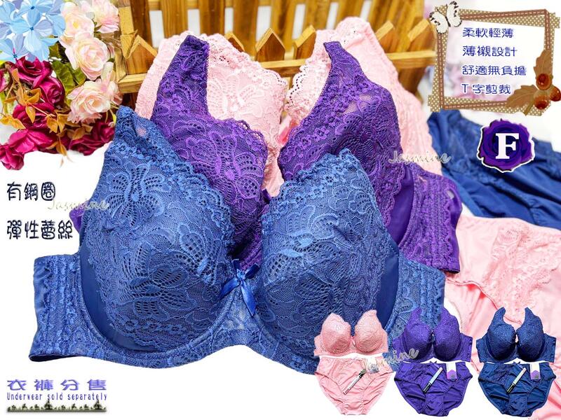 #365#  深藍 、深紫、粉 36F 38F 40F 42F 44F 衣褲分售 加大內褲 大彈性 蕾絲軟布 有鋼圈