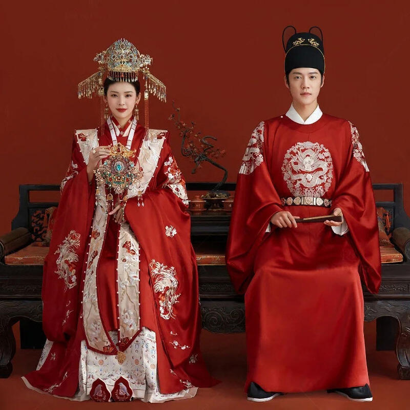 【台灣現貨】漢服結婚明制漢式婚服2023新款鳳冠霞披中式新娘嫁衣大婚情侶套裝