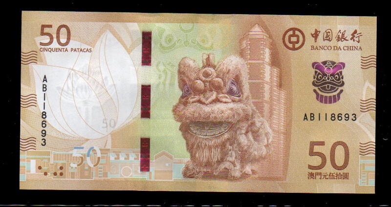 【低價外鈔】澳門 2023 (2025)年 50元 澳門幣 紙鈔一枚 中銀版 舞獅與 鏡湖歷史紀念館圖案 新發行