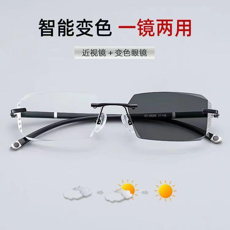 無框防藍光變色眼鏡男鉆石切邊平光鏡商務方形眼鏡框可配近視眼鏡