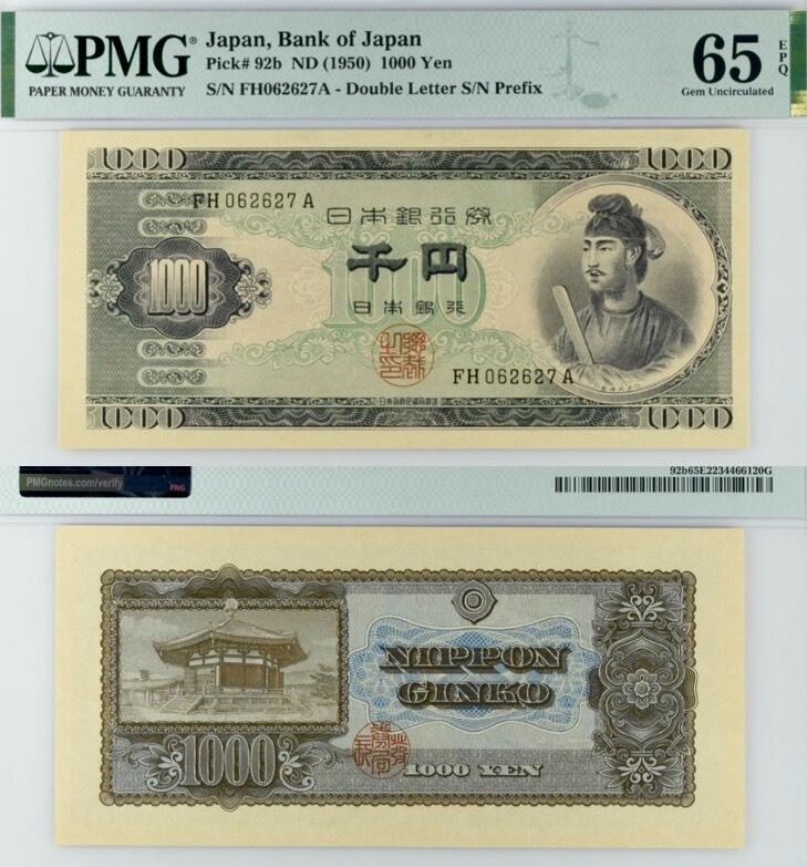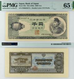 PMG 65分 日本紙幣B號卷 1950年 聖德太子1000円 27尾410 25尾425 26尾450 標尾-2807