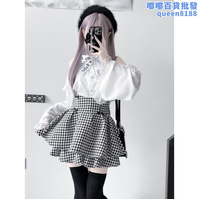 地雷系 地雷系衣服 y2k y3k 亞文化 原宿風 日系學院風甜美蕾絲花邊露肩襯衫高腰千鳥格半身裙兩件套