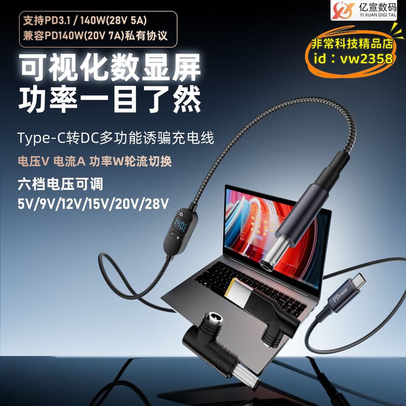 【台灣現貨】140w可調pd誘騙線type-c轉dc充電線六檔電壓5v9v12v15v20v28v換