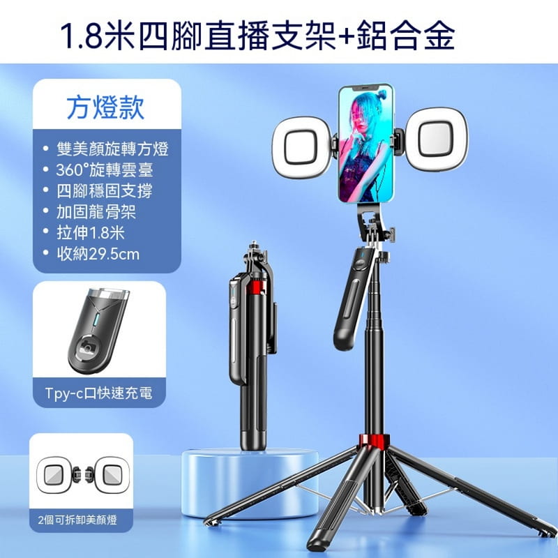 【PChome 24h購物】ZHENCAI 臻彩 1.8m鋁合金自拍桿+自拍器+雙方形燈 直播支架 手機自拍四腳架 R99N