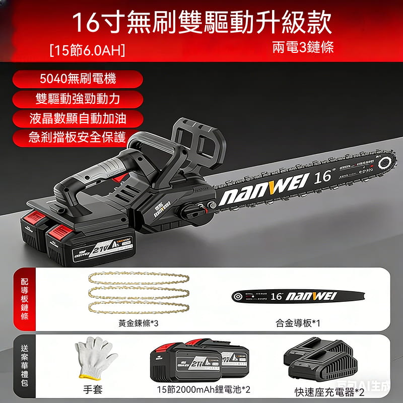【PChome 24h購物】【木洸】免插電小型手持式顯電鏈鋸16寸無刷鋰電電鋸-15節6.0Ah兩電3鏈條(鋰電電鋸/伐木鋸/手持鋸) R99N