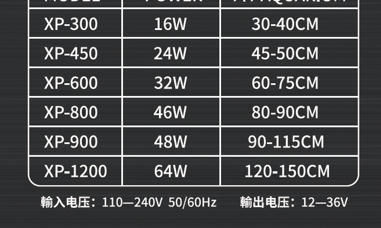 💯規格 : XP-300適合魚缸30-40Cm,XP-450適合魚缸40-55Cm,XP-600適合魚缸60-70Cm,XP-800適合魚缸80-90Cm,XP-900適合魚缸90-100Cm,XP-1200適合魚缸120-130Cm