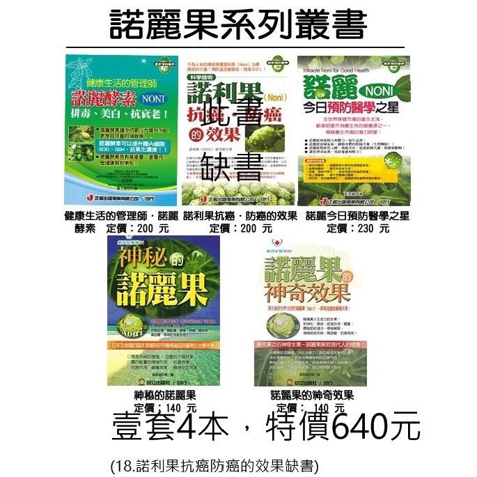 諾麗果系列叢書」壹套5本,缺書1本諾利果抗癌防癌的效果缺書,壹套共4本,特價640元